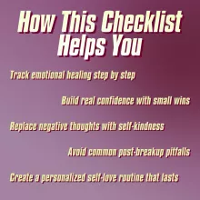 Unlike generic breakup advice, this checklist is built for action. No lectures. No long-winded journaling exercises. Just bite-sized steps designed to get you feeling grounded and confident, even if today hurts. It’s a judgment-free, self-guided reboot you can use at your own pace, over and over again.