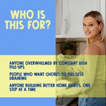 - Helps you figure out how to motivate yourself to wash dishes in a way that feels natural and achievable