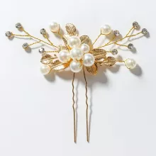 Meticulously crafted from high-quality alloy, adorned with radiant rhinestones and artificial pearls, this hair pin promises both durability and a dazzling appearance. Measuring approximately 8.5cm x 9.5cm (3.35” x 3.74”), it’s the perfect size to make a statement without overwhelming your hairstyle. The gold color, capturing the essence of sophistication, complements any outfit, enhancing your natural beauty and elegance.