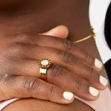 I recently treated myself to this ring and couldn't be happier. The design is absolutely stunning, combining a sleek metallic look with a gorgeous shell-like finish. It's incredibly well-made and feels very durable, yet it has a delicate appearance on my finger. I love how it catches the light and adds a touch of elegance to any outfit. It's definitely a piece that gets noticed and I've received so many compliments on it. I'm so pleased with this purchase and feel like it's a timeless piece that I'll wear for years