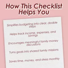 This checklist is for any parent or guardian who wants to get serious about how to plan a family budget—without spreadsheets overload or financial jargon. Whether you’re just getting started or need a fresh, fun approach, this is the family-friendly tool you’ve been looking for.