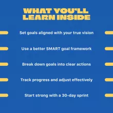 • Setting Smart, Strategic Goals – Discover a fresh take on SMART goals, align them with your values, and follow prompts to craft your first real goal.