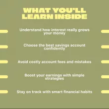 - Perfect for beginners who want to learn how to save money in bank with interest