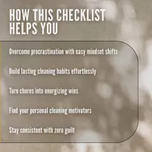 I've always struggled with cleaning motivation, but this checklist has been a lifesaver. The 10 bite-sized tasks are totally doable and I love the 5-minute rule - it's really helped me get started without feeling overwhelmed.