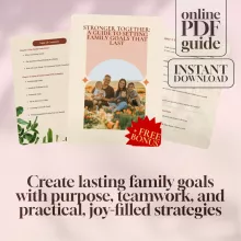 Looking to bring your family closer while achieving meaningful milestones together? Stronger Together: A Guide to Setting Family Goals That Last is your step-by-step roadmap to building a united, goal-driven household. Whether you want more quality time, better communication, or healthier habits, this beautifully designed digital guide helps you align as a family and move forward with clarity. Inside, you’ll discover real-life inspiration, practical strategies, and specific examples of family goals that you can use or adapt for your own unique crew. Designed to be simple, flexible, and fun for all ages, this guide helps you make goal-setting a family tradition that sticks.